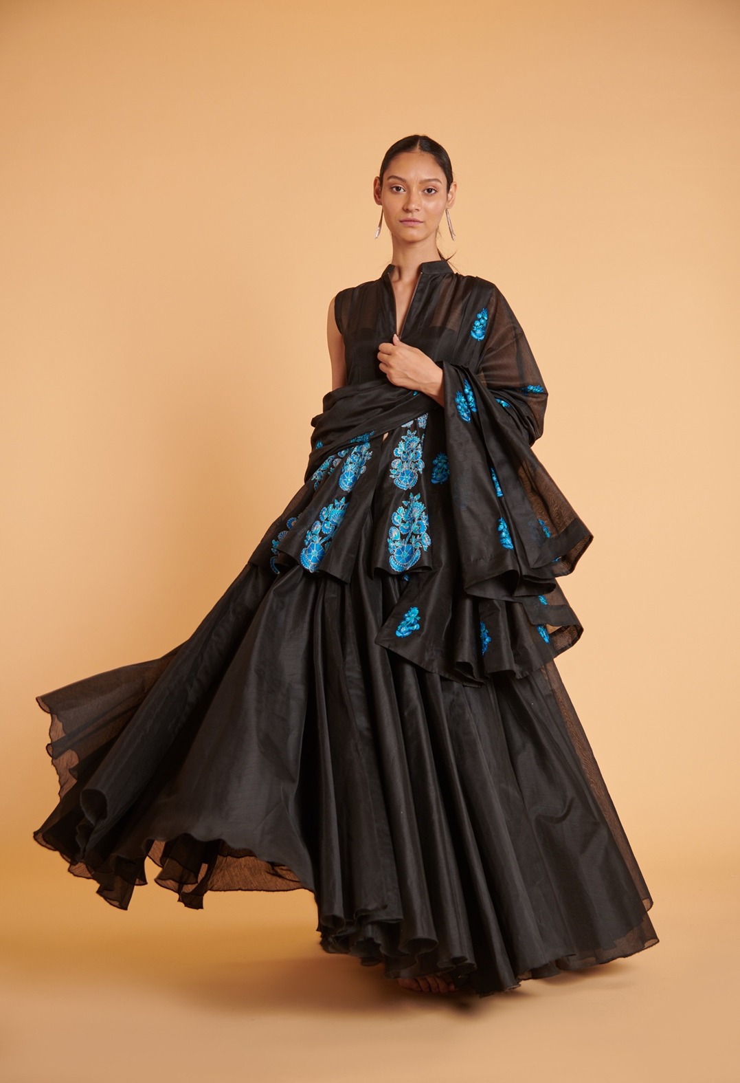 Black chanderi short Anarkali with gradient blue threadwork booties, umbrella skirt and dupatta to match