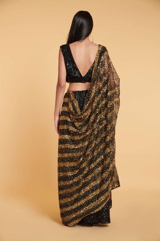 Black hand embroidered sequin saree with gold stripe pallu and sequin blouse to match