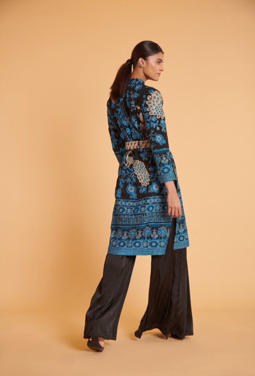Black matka silk Achkan with zari, crystals & blue Kashmiri threadwork paired with black satin hakama pants & zari belt