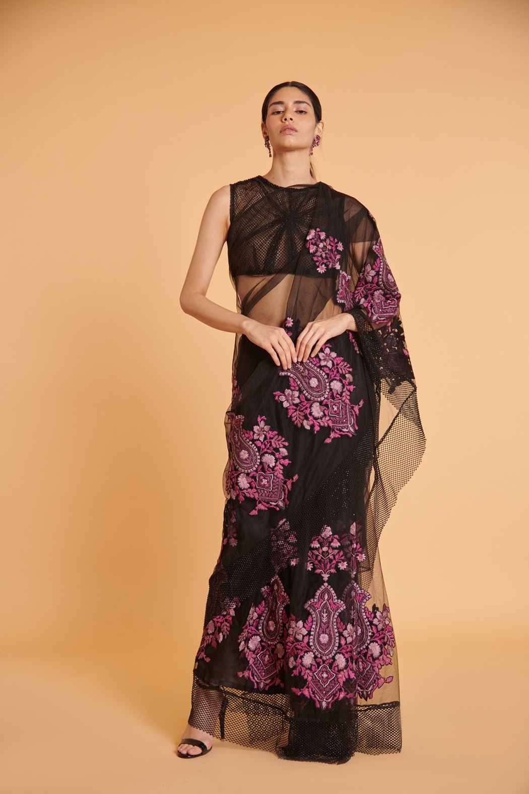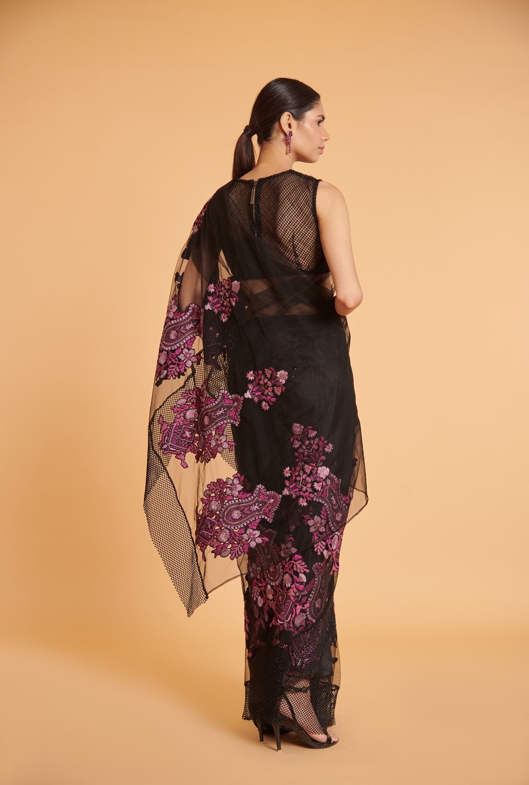 Black net saree with purple threadwork booties and crystal mesh border paired with black crystal mesh knotted blouse