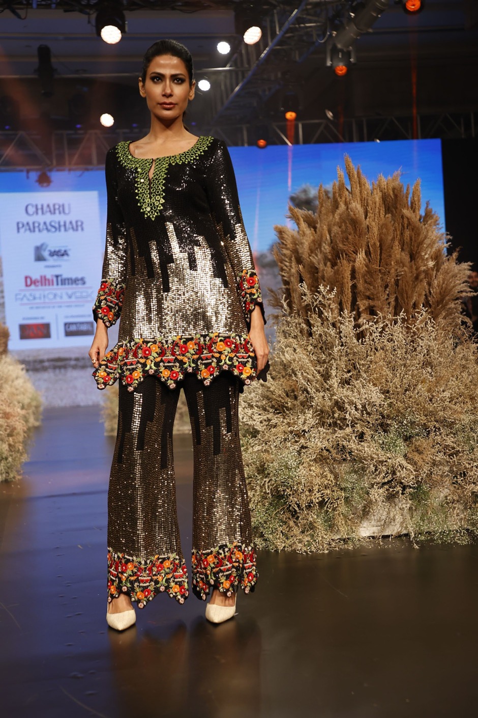 Black sequins embroidered short kurti with pants .