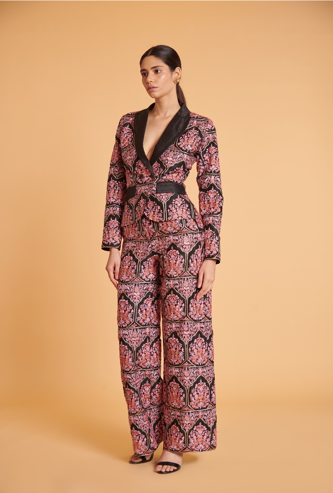 Black tusser double breasted suit with blush threadwork baroque embroidery