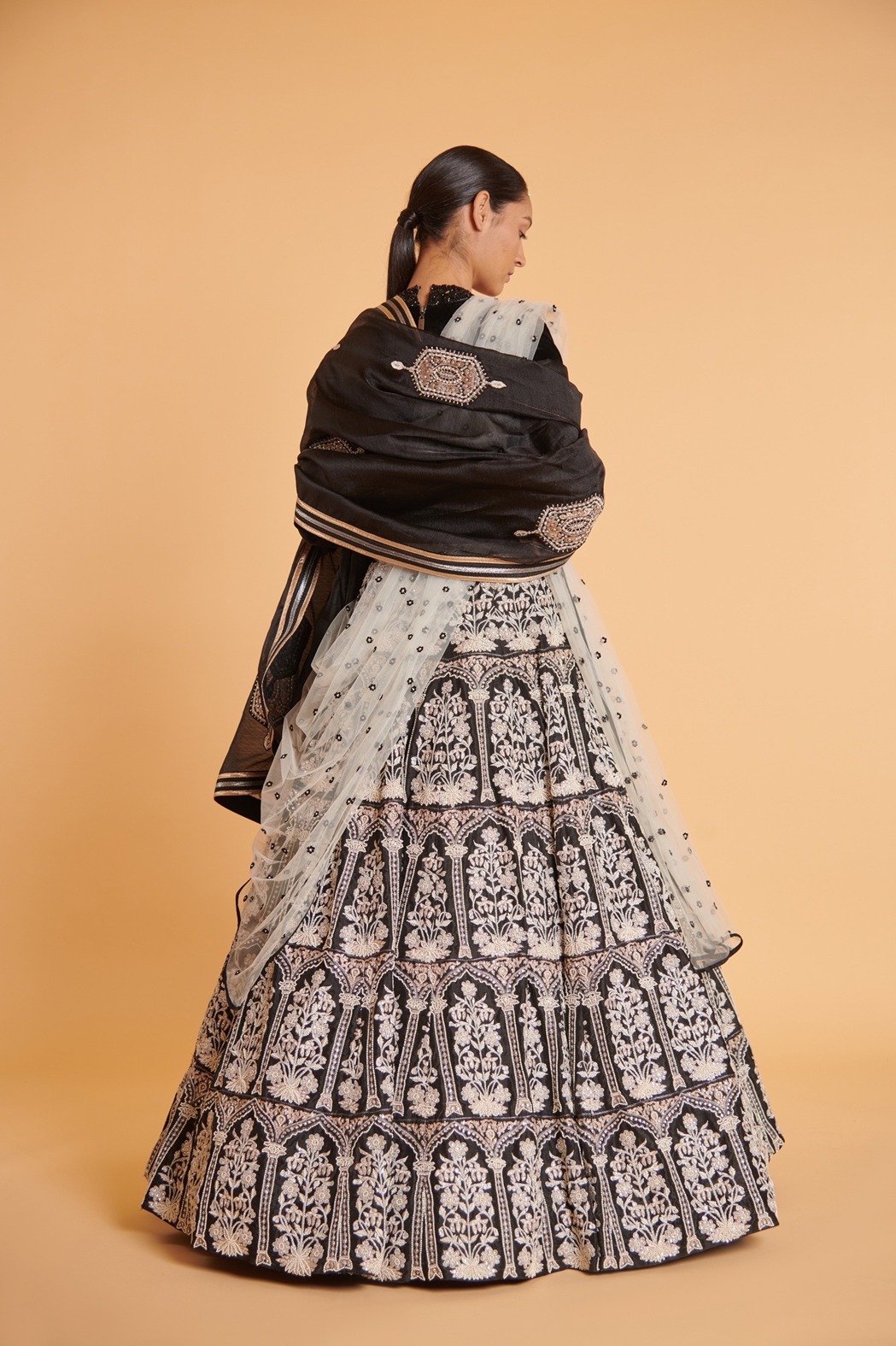 Black tusser lehenga with crystal, pearl, bead, aari, zari and threadwork paired with black crystal & rhinestone sheer web velvet blouse, organza crystal motif dupatta and ivory crystal booti net dupatta .