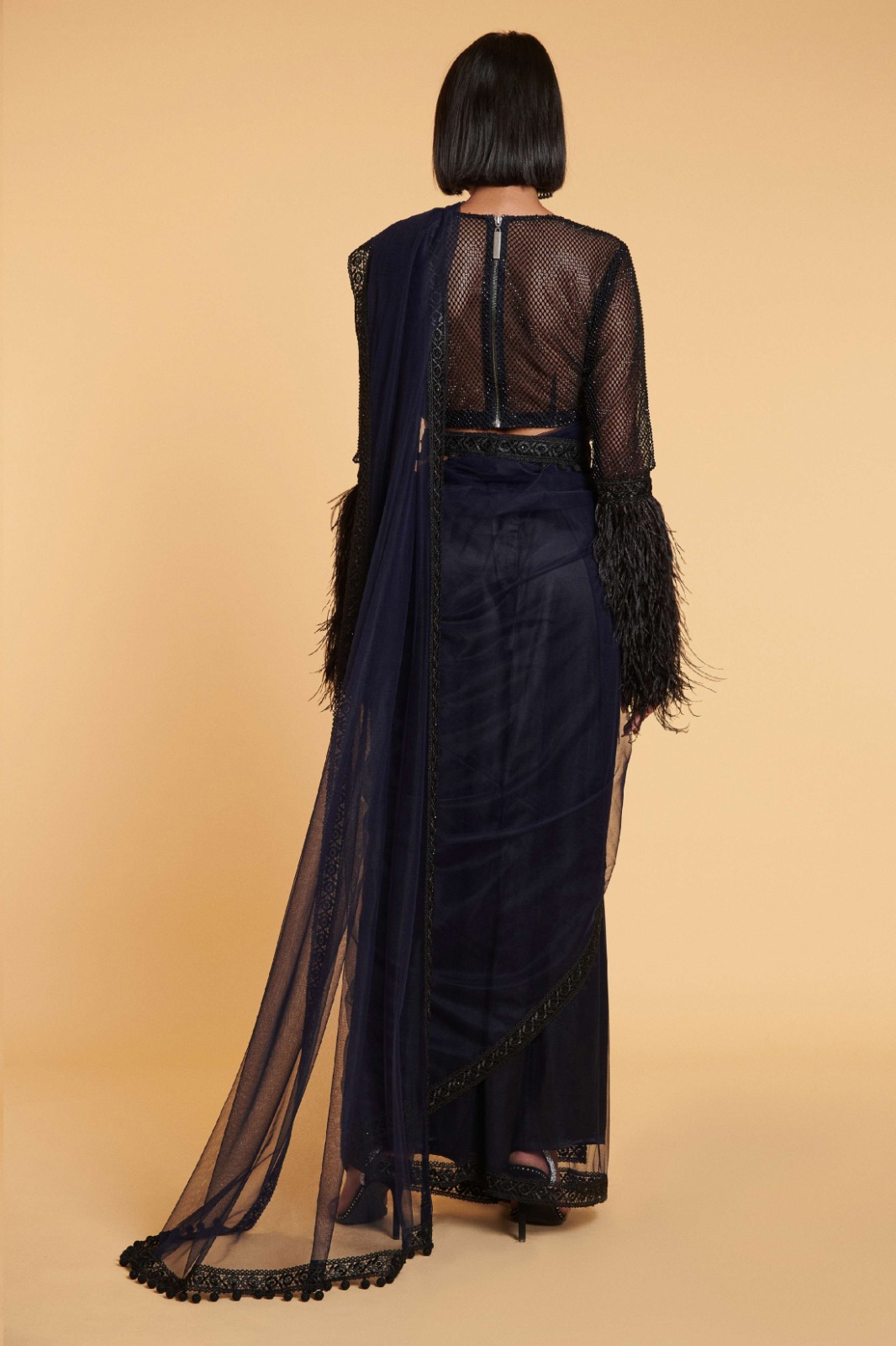 Black knotted crystal mesh blouse with feather detailing. Navy net saree with crochet and belt