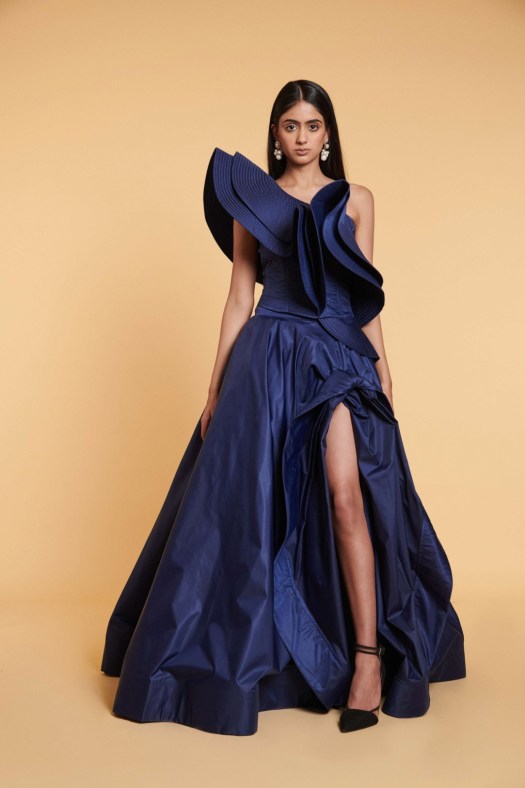 Navy nylon structural corset and Navy nylon umbrella skirt with cinched slit.