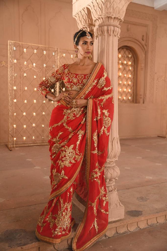 Red sari with intricate gold embroidery